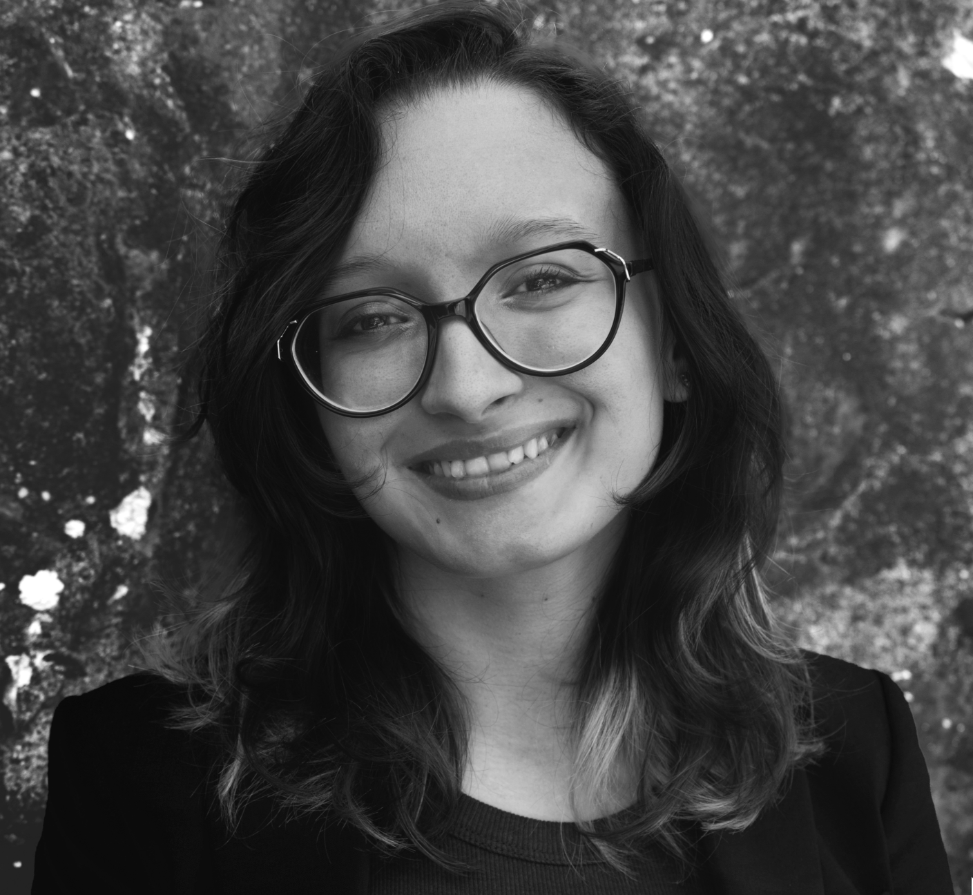 A smiling person with short hair, glasses, and a button-up shirt, sitting with hands clasped. Black and white photo.